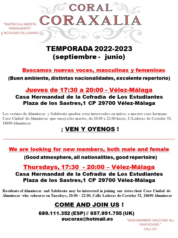 El grupo hermano del coro también busca nuevos integrantes en Almuñecar y Salobeña que ensayen los martes de 20 a 22 horas en la calle Laderas de Castelar 52 de Almuñecar. Los interesados pueden participar en la práctica, e-mail [email protected] o llamar al 689 11 13 52.
