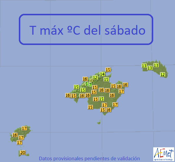 Resumen Sábado (hasta las 18.30 h) – 17,4 ºC de máxima (Son Servera); mínima de 4,0 °C (Serra Alfabia, Bunyola); racha más fuerte, 100 km/h (Serra Alfabia); Precipitaciones, 42,8 litros por metro cuadrado (Son Torrella, Escorca), 39,2 (Colonia Sant Pere), 38,2 (Pollensa).