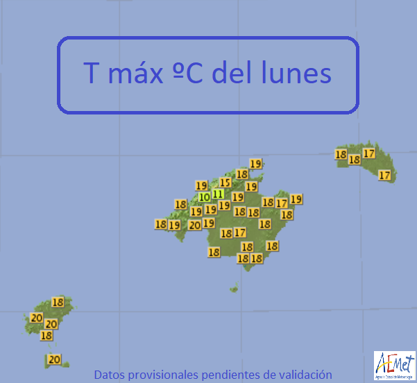 Resumen lunes (hasta las 19 h) – Máximas de 19,6 Puerto Palma y 19,4 Puerto Pollensa; Mínimos de 3,1 Son Torrella (Escorca), 6,6 Campos, 6,8 Petra; Precipitaciones, 0,2 litros por metro cuadrado Llucmajor y Porreres.