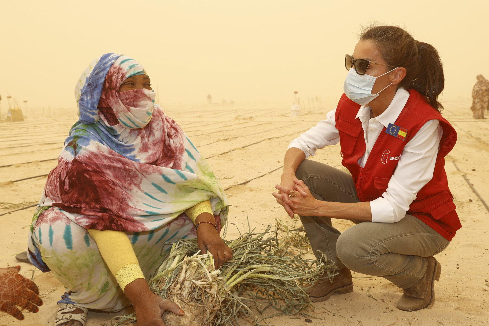 La reina Letizia de España se vio atrapada en una tormenta de arena el jueves 2 de junio mientras visitaba Mauritania para ver los jardines del desierto establecidos hace un mes como parte del proyecto Orchards en Nouakchott.