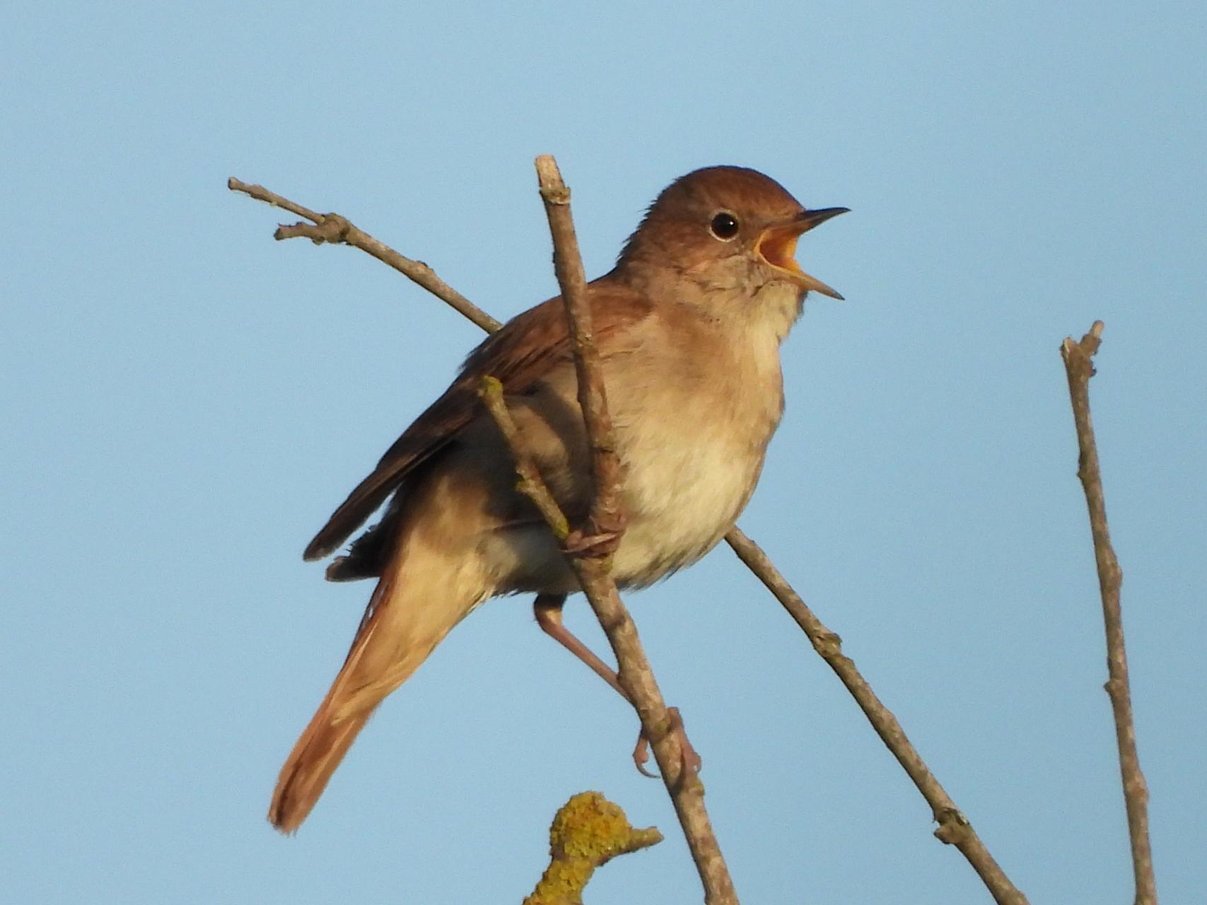 Un criador de verano común en Mallorca, el ruiseñor (Luscinia megarhynchos), quizás no por su plumaje, pero sí por su canto. A partir de finales de abril, los isleños escucharán el hermoso canto en el que los machos intentan superarse unos a otros para atraer a una hembra, con sus cantos incorporando tonos cada vez más elaborados. Incluso escuché uno compitiendo con eso. Gran curruca juncia en un pequeño cañaveral – triunfó el ruiseñor.
