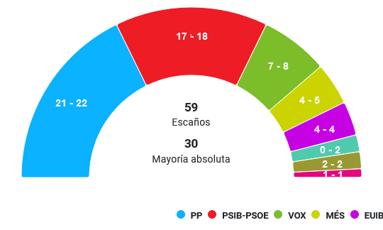 El sondeo de IB3 TV dice que el Partido Popular alcanzará entre 21 y 22 diputados en el Parlamento Balear, el Partido Socialista de España (PSOE) entre 17 y 18 y el grupo de extrema derecha Vox entre 7 y 8 diputados Nacionalistas mallorquines en Mes, entre 4 y 5 y la extrema izquierda Podemos 4.